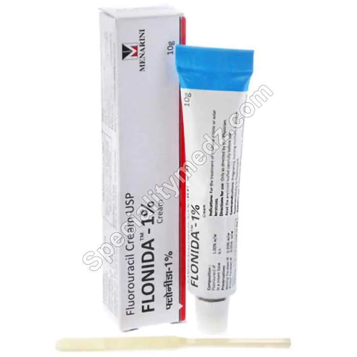 Flonida Cream is a topical medication that contains Fluorouracil.  It is utilized for the management of actinic keratoses, a precancerous dermatological disorder characterized by rough and scaly skin resulting from prolonged sun exposure.  Flonida Cream Uses are also done to address a form of skin cancer referred to as superficial basal cell carcinoma.  This medication functions by suppressing the proliferation of atypical cells throughout the body.